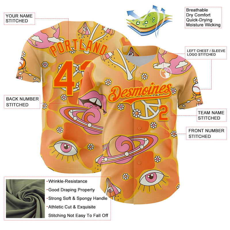 Custom Gold Orange-Yellow 3D Pattern Design Trippy Magic Mushrooms Groove Authentic Baseball Jersey