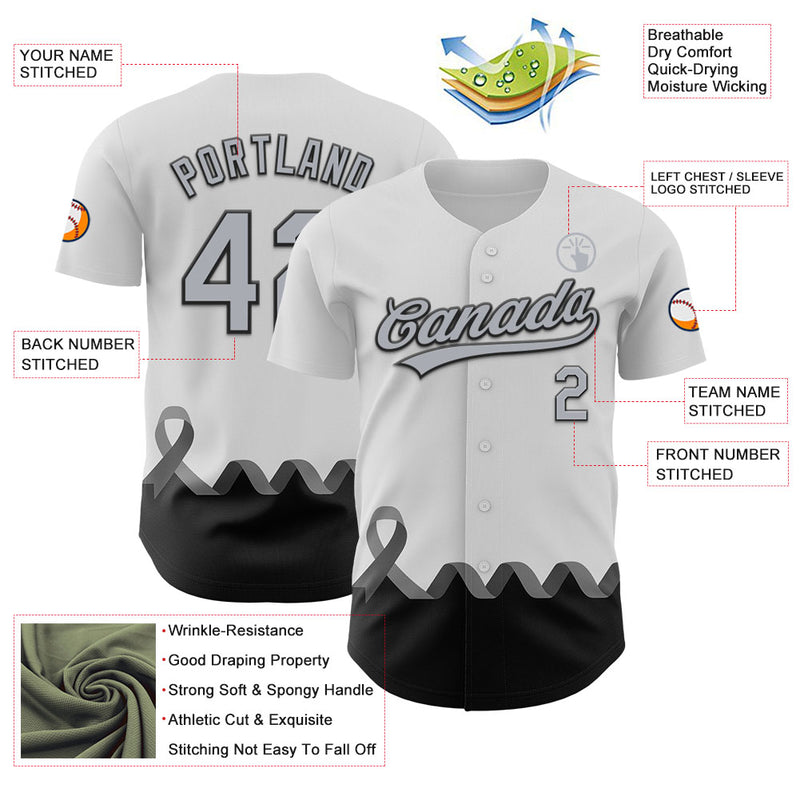 Custom White Gray-Black 3D Brain Cancer Ribbon Authentic Baseball Jersey