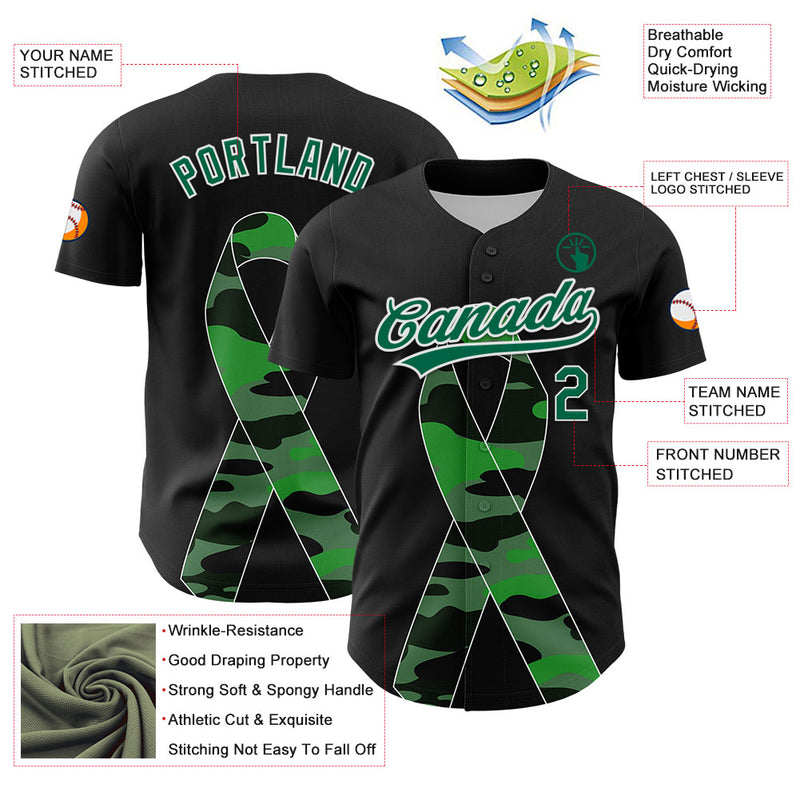 Custom Black Kelly Green-White 3D Liver Cancer Ribbon Authentic Baseball Jersey