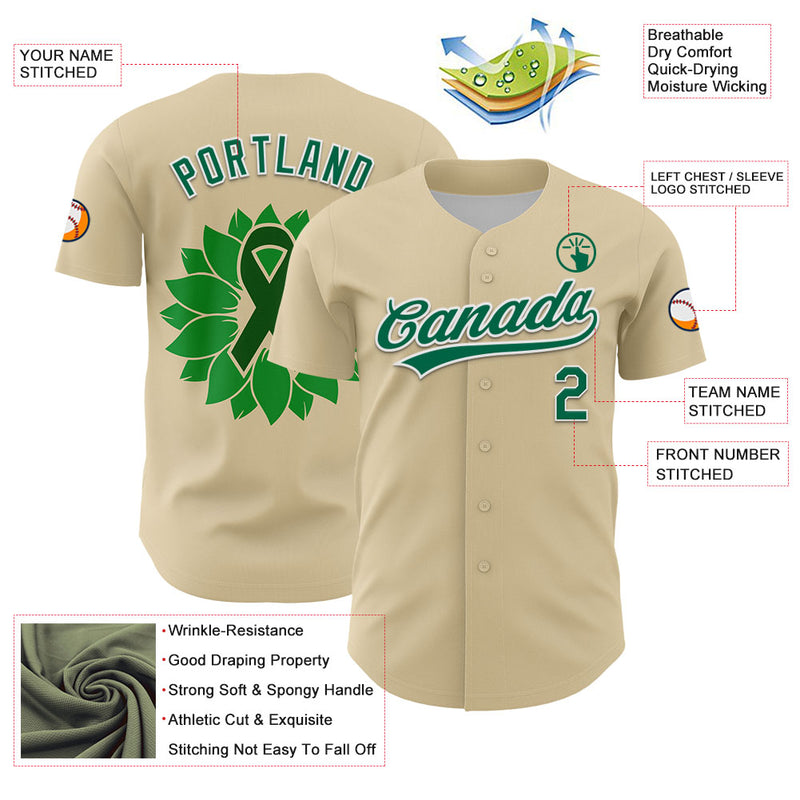 Custom Cream Kelly Green-White 3D Liver Cancer Ribbon Authentic Baseball Jersey