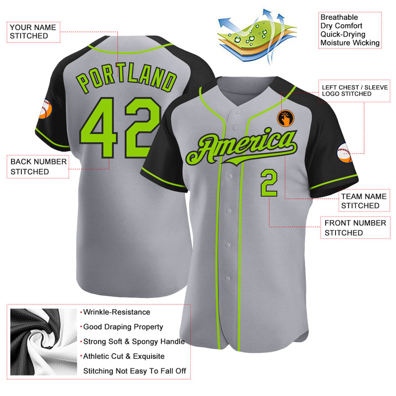 Custom Gray Neon Green-Black Authentic Raglan Sleeves Baseball Jersey