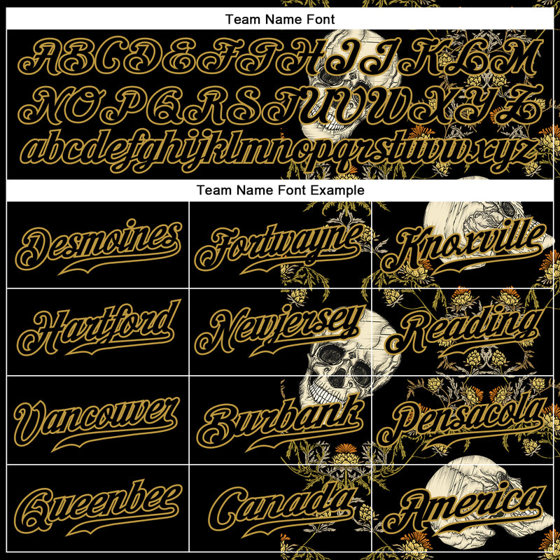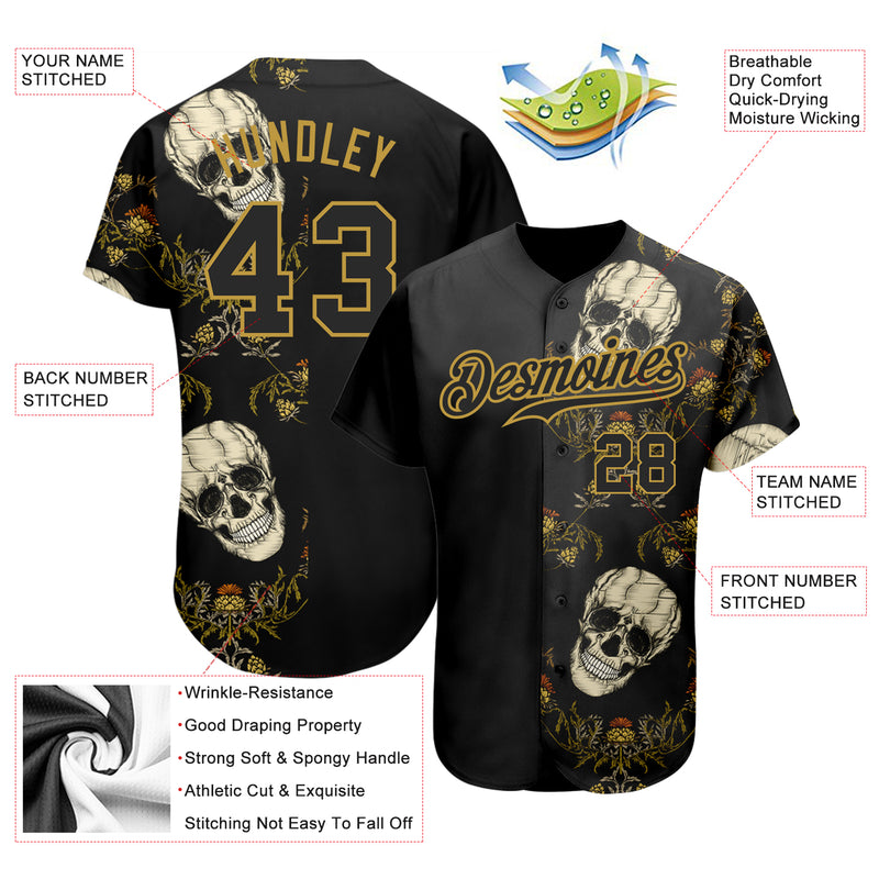 Custom Black Old Gold 3D Plant And Skull Fashion Authentic Baseball Jersey