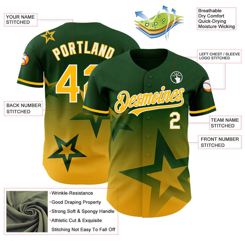 Custom Green Gold-White 3D Pattern Design Gradient Style Twinkle Star Authentic Baseball Jersey
