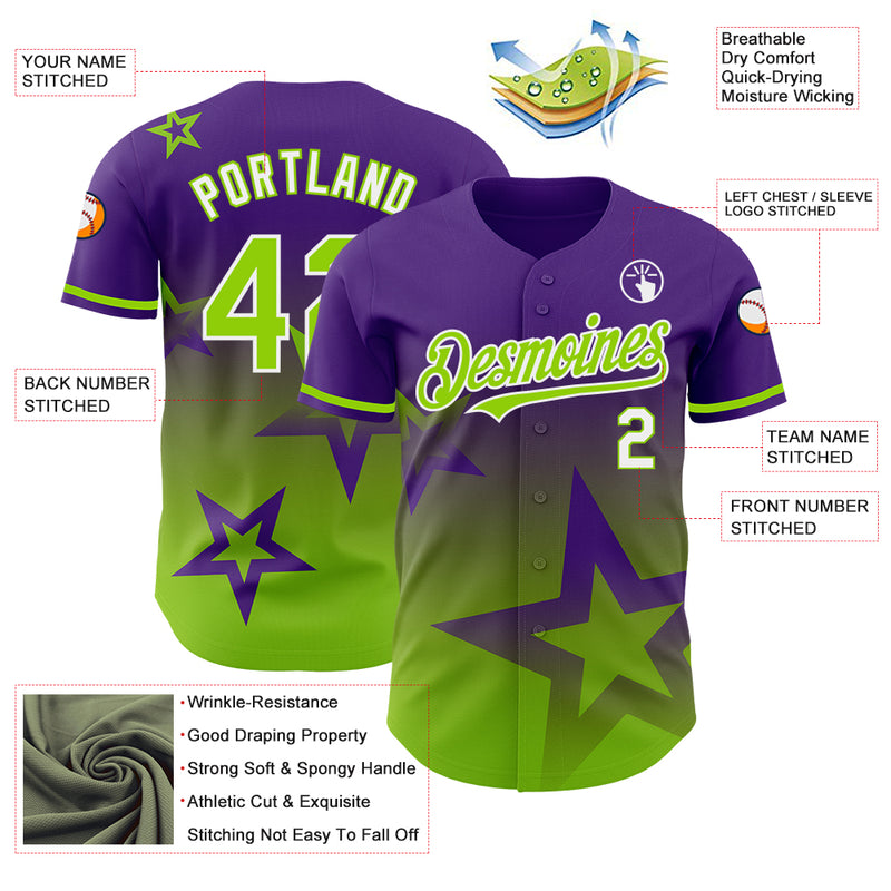 Custom Purple Neon Green-White 3D Pattern Design Gradient Style Twinkle Star Authentic Baseball Jersey