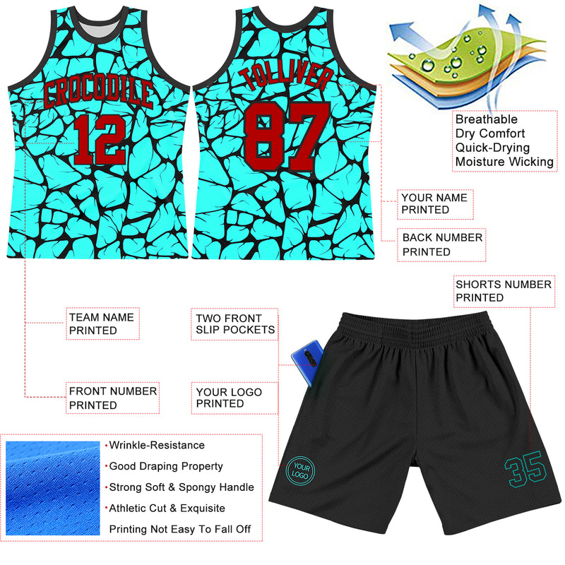 Custom Aqua Red-Black Abstract Network Round Neck Sublimation Basketball Suit Jersey