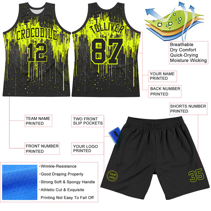Custom Black Neon Green Dripping Splatter Art Round Neck Sublimation Basketball Suit Jersey