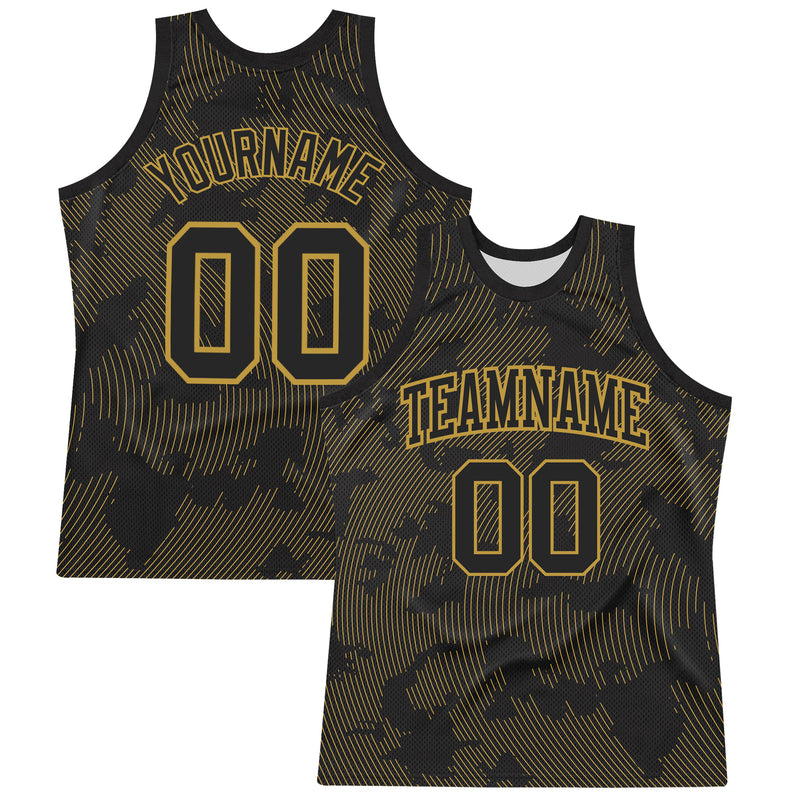 Custom Black Old Gold Curve Lines Round Neck Sublimation Basketball Suit Jersey
