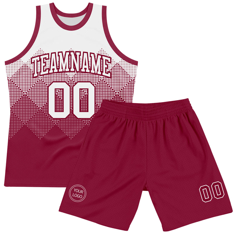Custom White Maroon Gradient Square Shapes Round Neck Sublimation Basketball Suit Jersey