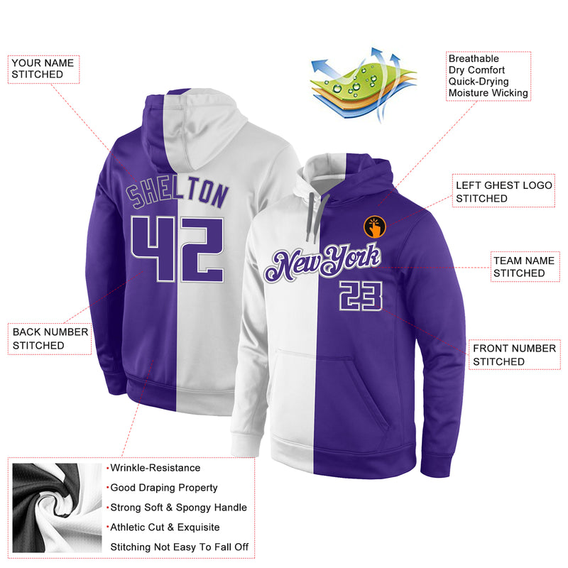 Custom Stitched White Purple-Gray Split Fashion Sports Pullover Sweatshirt Hoodie