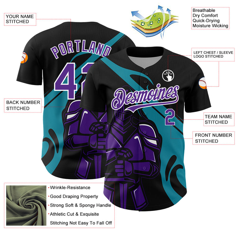 Custom Black Purple-Teal 3D Pattern Design Knight Hero Art Authentic Baseball Jersey
