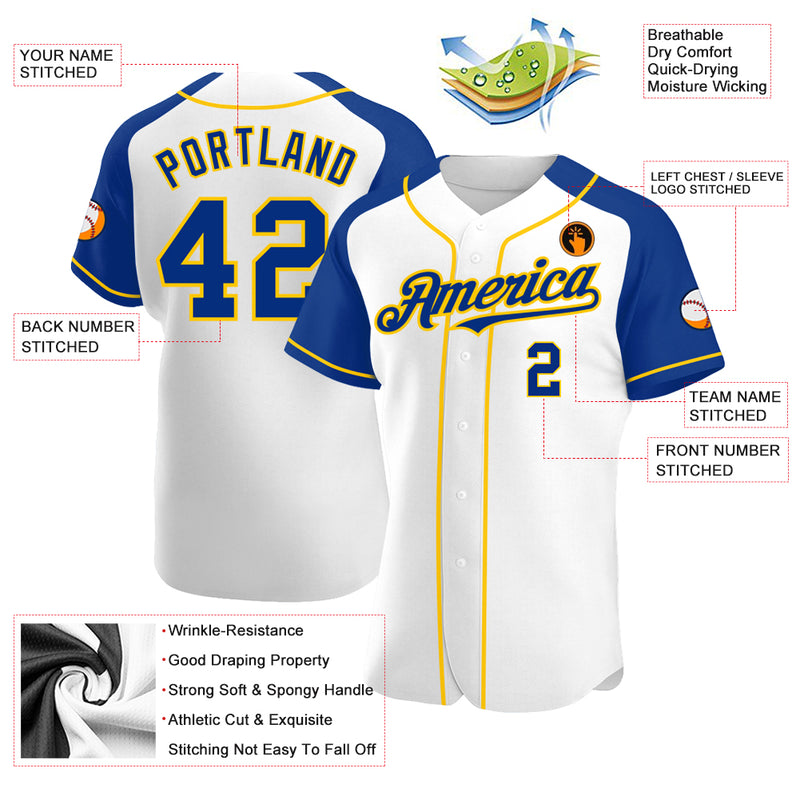 Custom White Royal-Yellow Authentic Raglan Sleeves Baseball Jersey