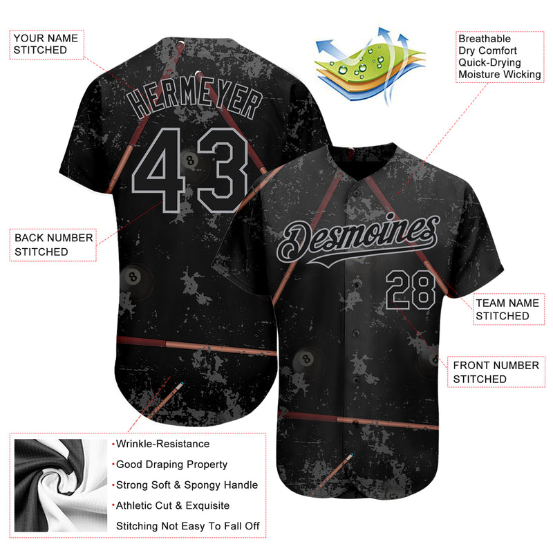 Custom Black Gray 3D Pattern Design Billiards Snooker 8 Ball Authentic Baseball Jersey