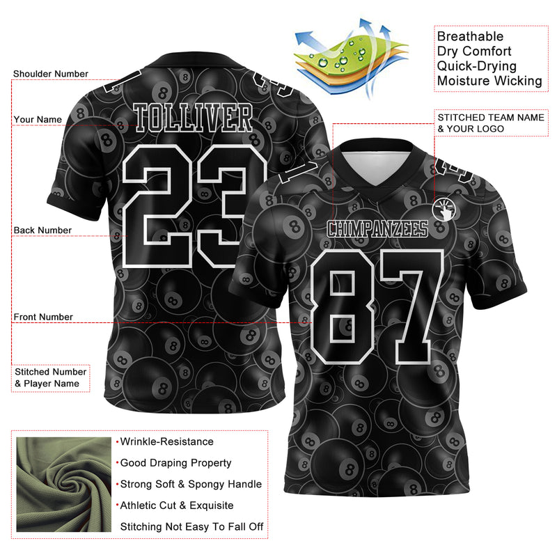 Custom Black White 3D Pattern Billiards Snooker 8 Ball Authentic Football Jersey