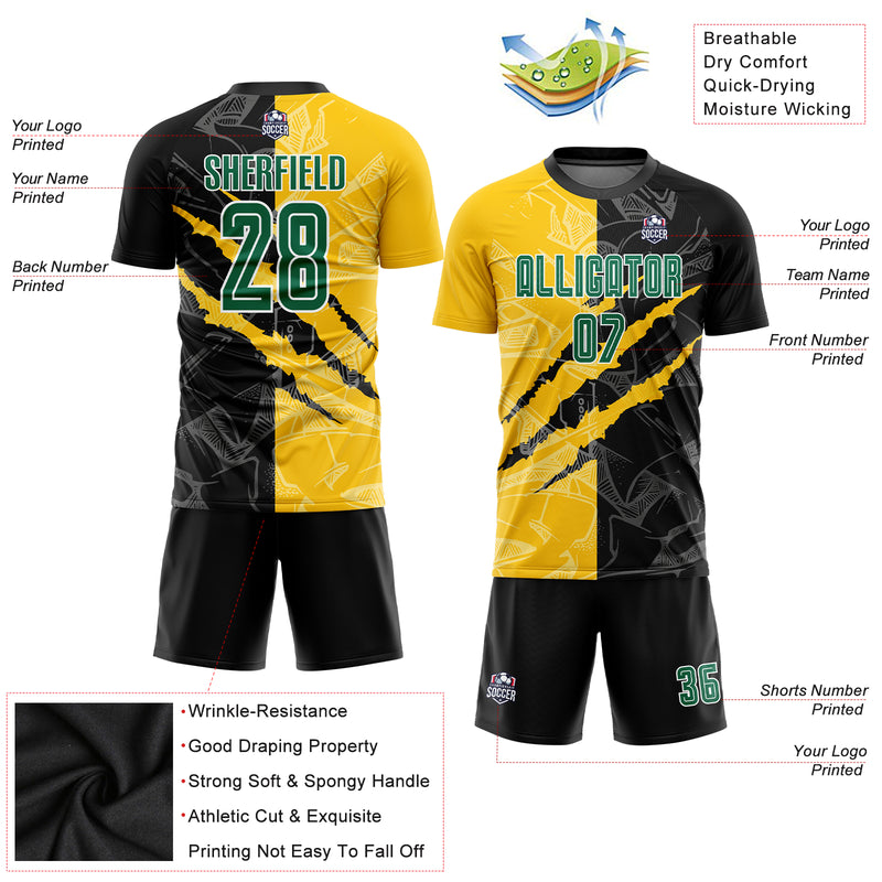 Custom Graffiti Pattern Kelly Green Black-Yellow Scratch Sublimation Soccer Uniform Jersey
