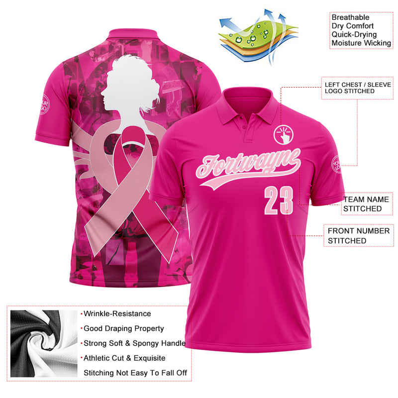 Custom Pink Light Pink-White 3D Pink Ribbon Breast Cancer Awareness Month Women Health Care Support Performance Polo Shirt