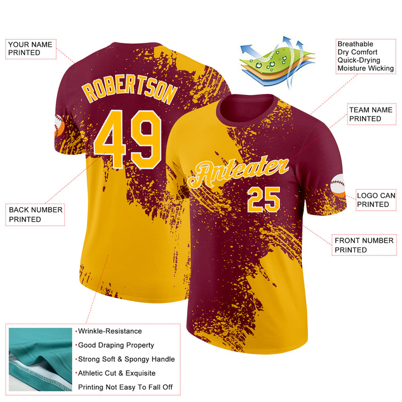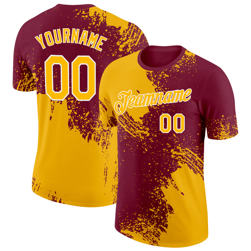 Custom Gold Crimson-White 3D Pattern Design Abstract Brush Stroke Performance T-Shirt