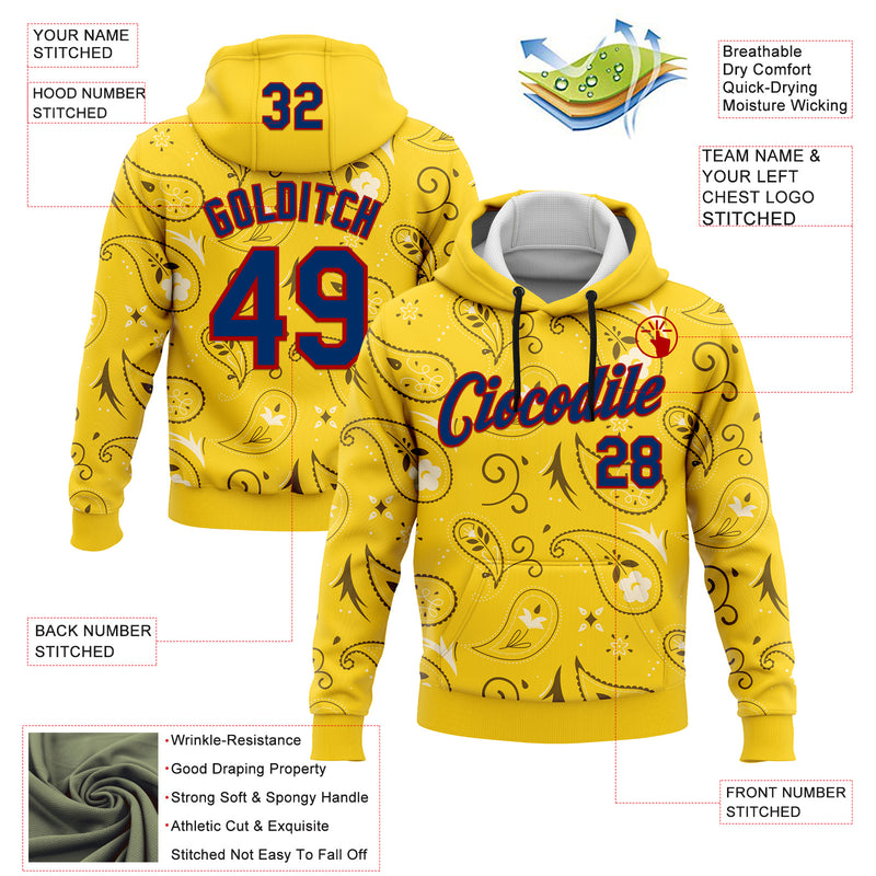 Custom Stitched Yellow US Navy Blue-Red 3D Pattern Design Ethnic Paisley Floral Bandana Sports Pullover Sweatshirt Hoodie