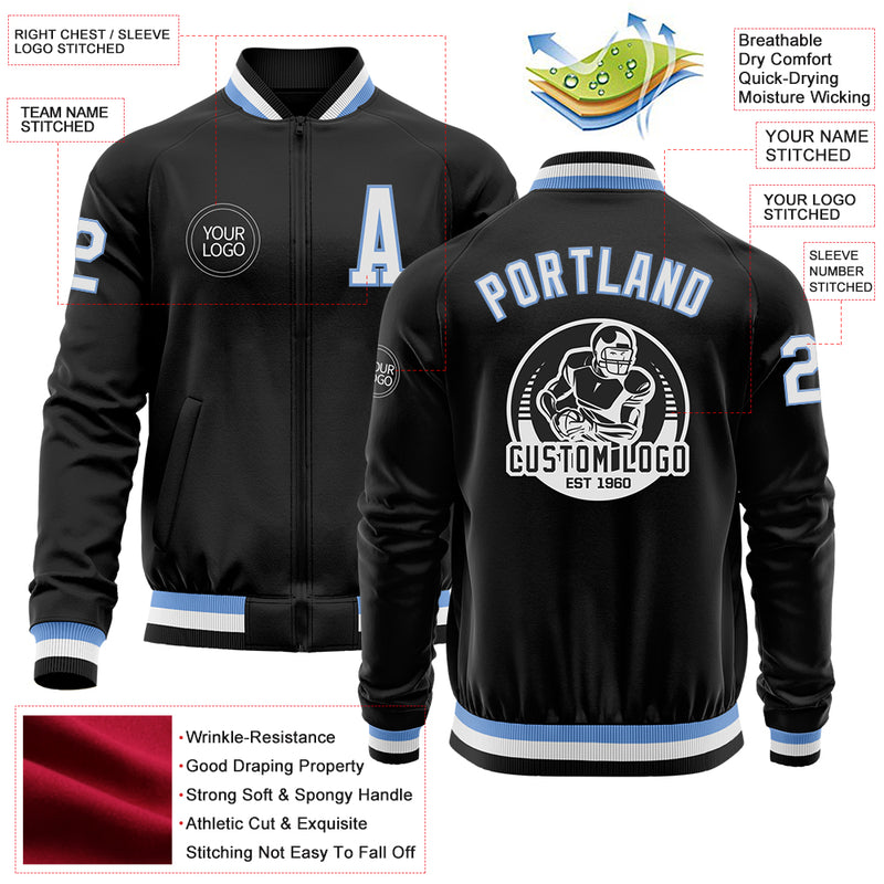 Custom Black Light Blue-White Bomber Varsity Letterman Zipper Jacket