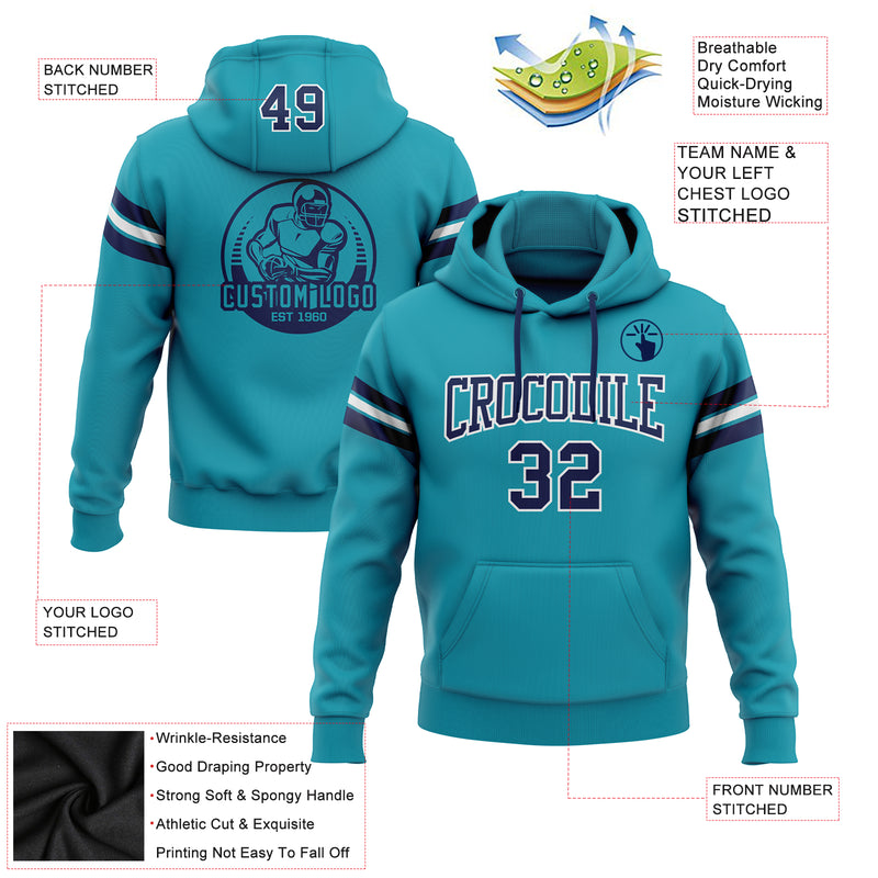 Custom Stitched Teal Navy-White Football Pullover Sweatshirt Hoodie
