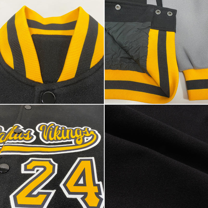 Custom Black Gold-Gray Bomber Full-Snap Varsity Letterman Two Tone Jacket