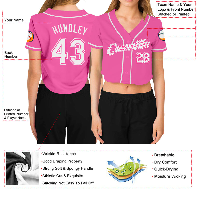 Custom Women's Pink White V-Neck Cropped Baseball Jersey