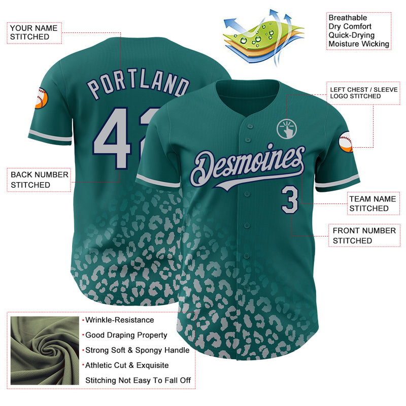 Custom Teal Gray-Navy 3D Pattern Design Leopard Print Fade Fashion Authentic Baseball Jersey