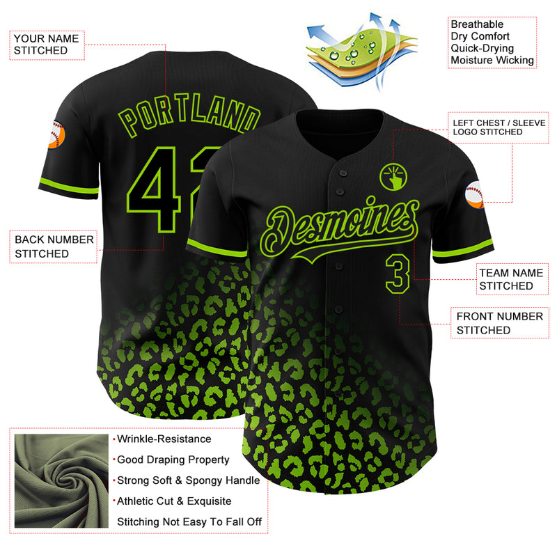 Custom Black Neon Green 3D Pattern Design Leopard Print Fade Fashion Authentic Baseball Jersey
