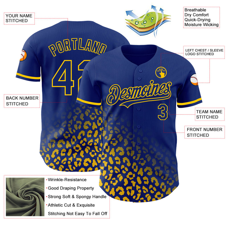 Custom Royal Yellow 3D Pattern Design Leopard Print Fade Fashion Authentic Baseball Jersey