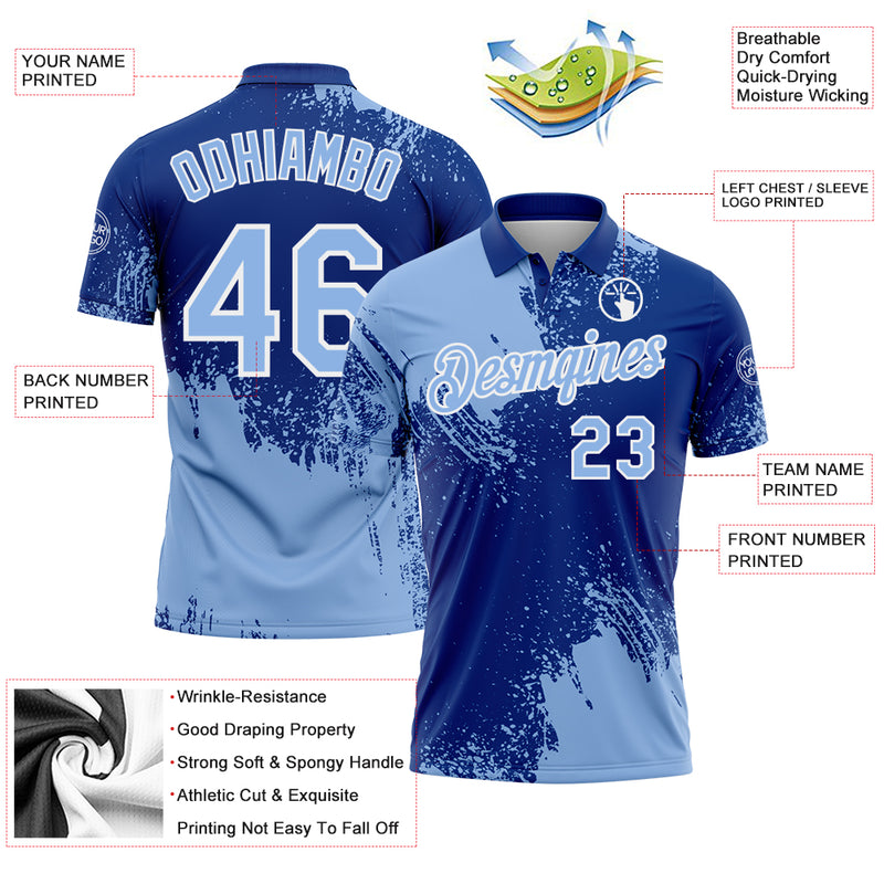 Custom Light Blue Royal-White 3D Pattern Design Abstract Brush Stroke Performance Polo Shirt
