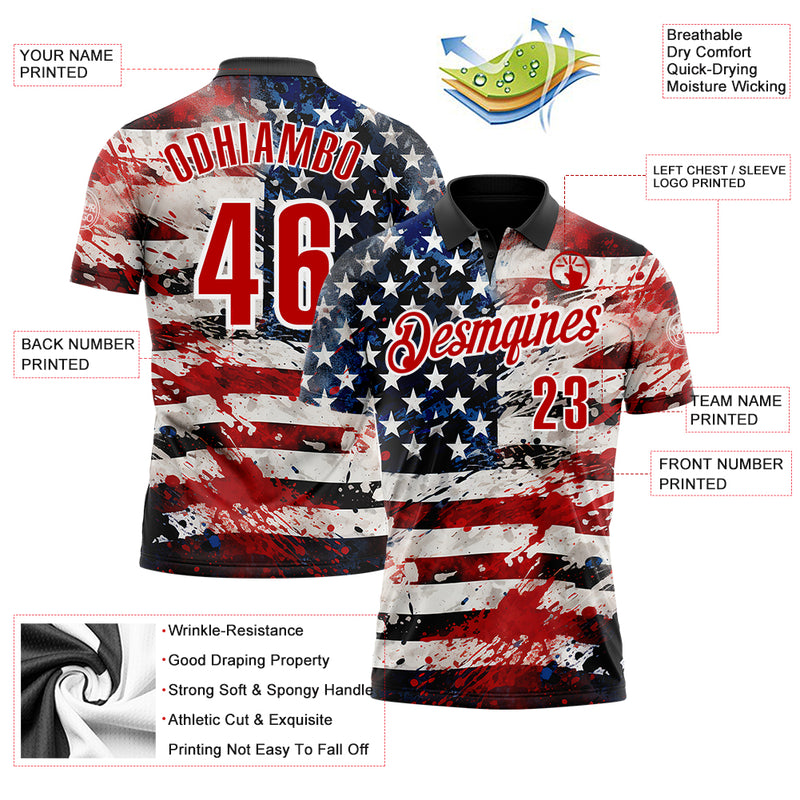Custom Black Red-White 3D American Flag Performance Polo Shirt