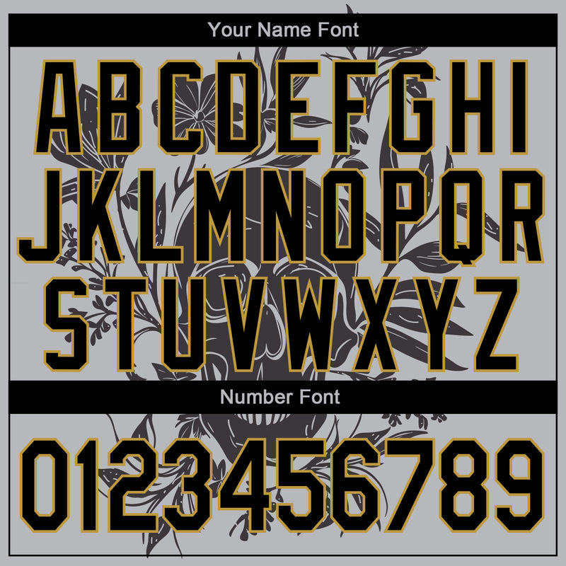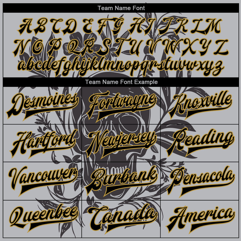 Custom Gray Black-Old Gold Skull With Flowers 3D Bomber Full-Snap Varsity Letterman Two Tone Jacket