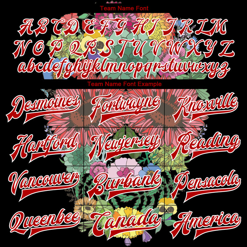 Custom Black Red-White Skull With Flowers 3D Bomber Full-Snap Varsity Letterman Jacket