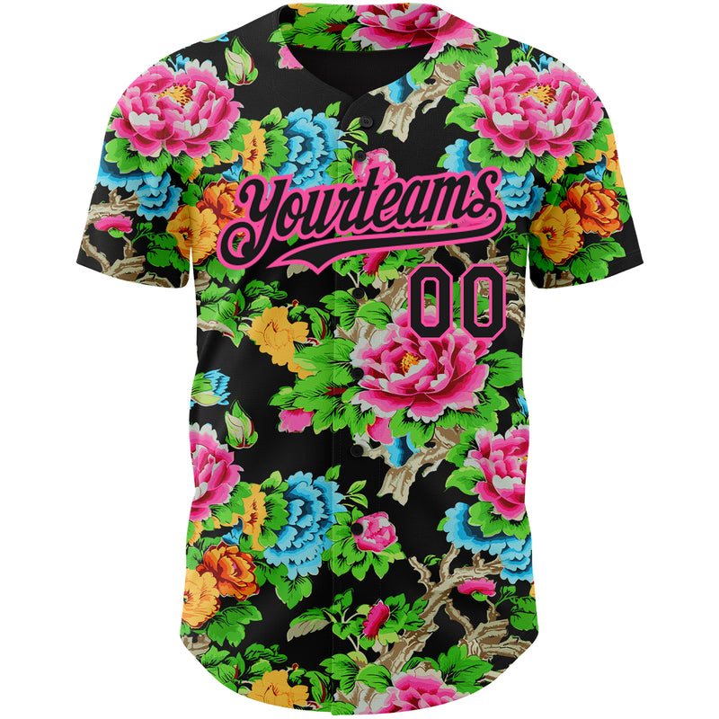 Custom Black Pink 3D Pattern Design Northeast China Big Flower Authentic Baseball Jersey