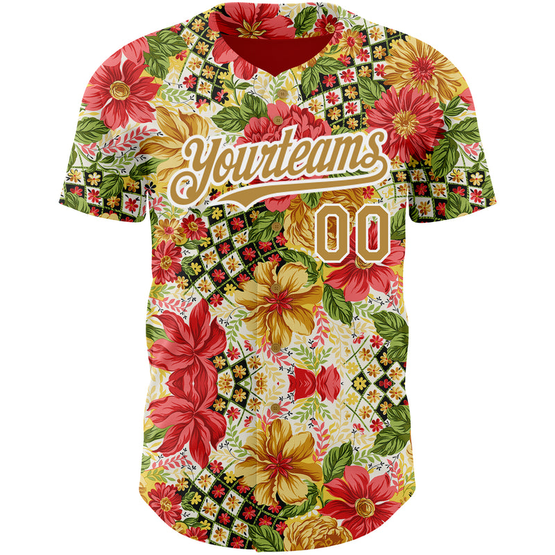 Custom Red Old Gold-White 3D Pattern Design Northeast China Big Flower Authentic Baseball Jersey