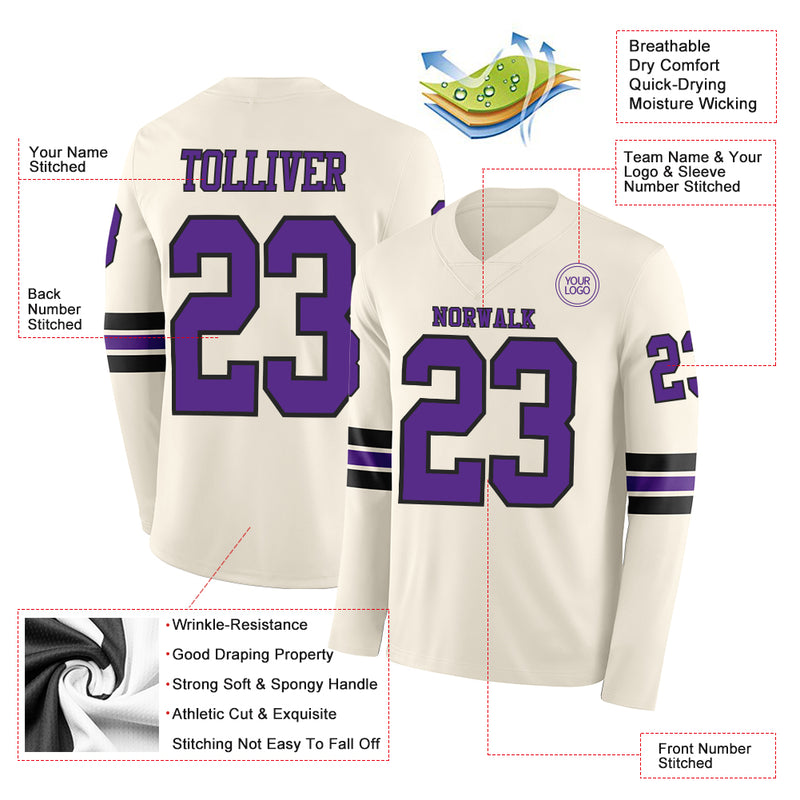 Custom Cream Purple-Black Long Sleeve Authentic Football Jersey