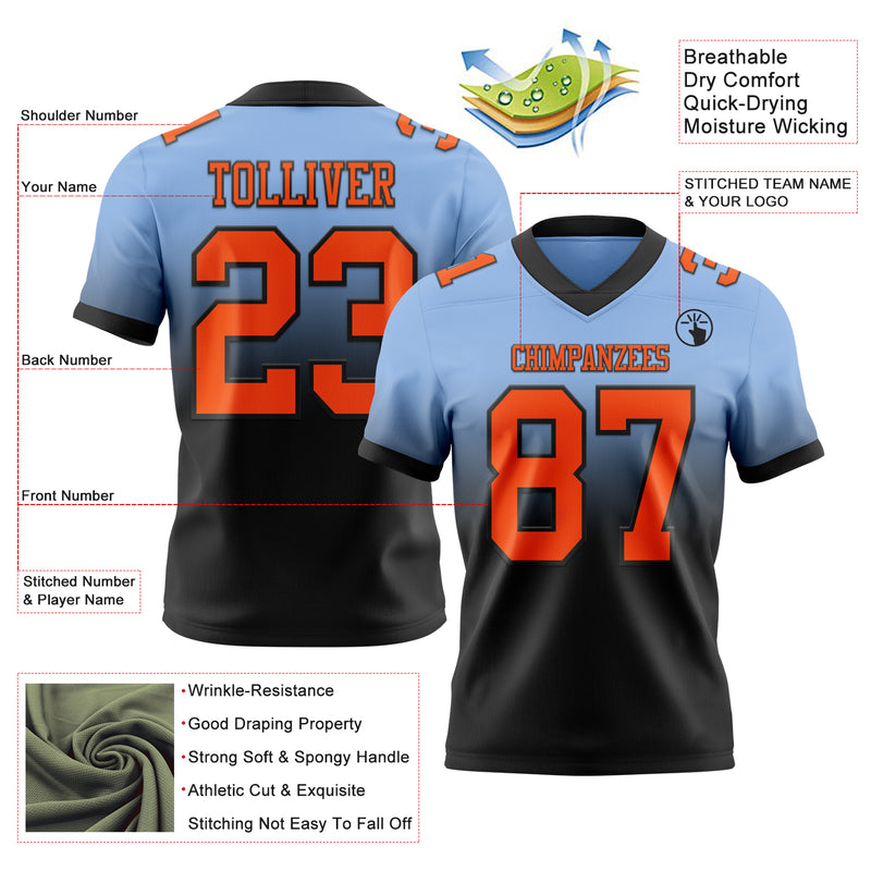 Custom Light Blue Orange-Black Authentic Fade Fashion Football Jersey