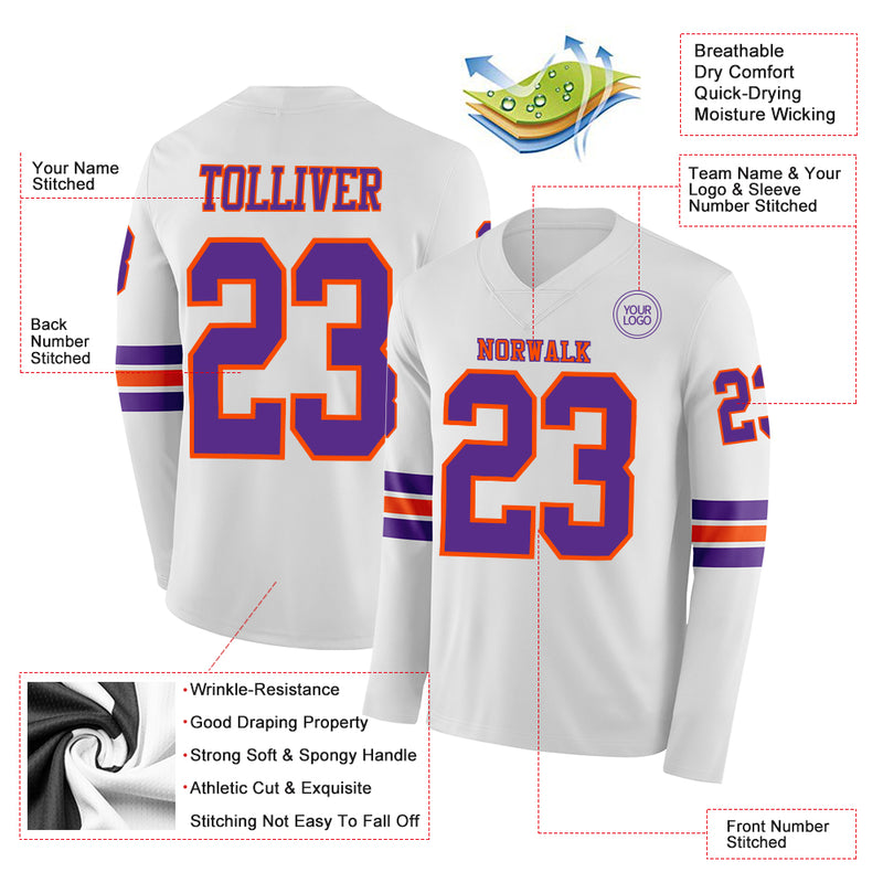 Custom White Purple-Orange Long Sleeve Authentic Football Jersey