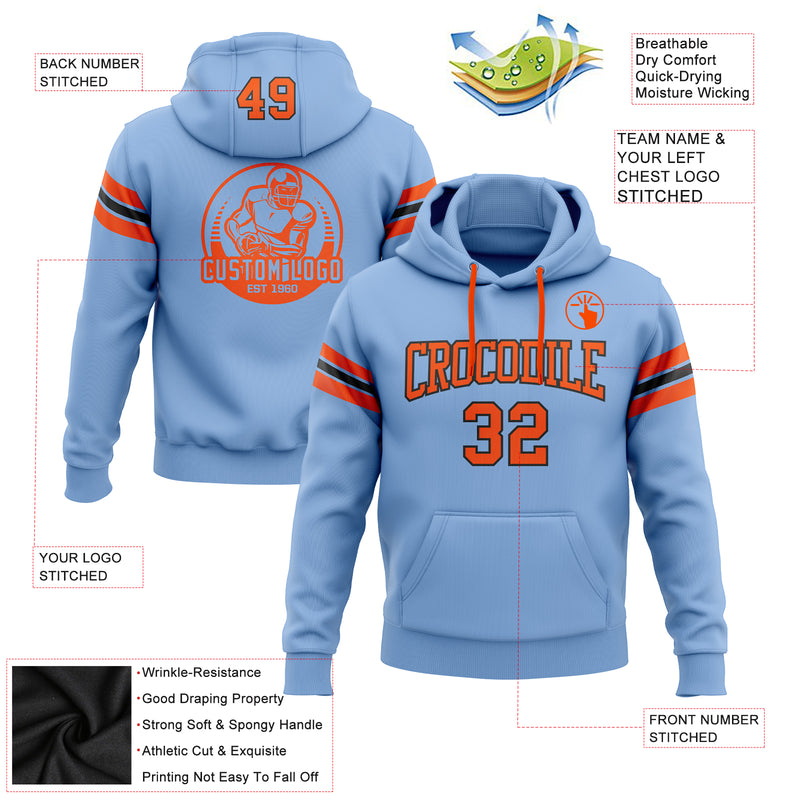 Custom Stitched Light Blue Orange-Black Football Pullover Sweatshirt Hoodie