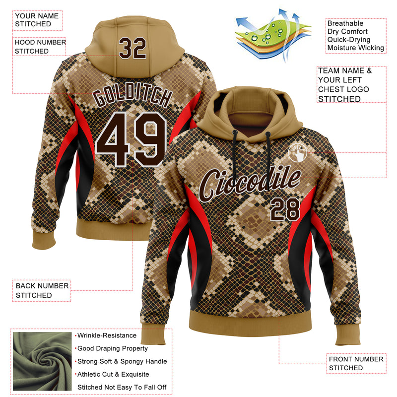 Custom Stitched Old Gold Brown Black Red-White 3D Pattern Design Snake Skin Print Sportswear Pullover Sweatshirt Hoodie