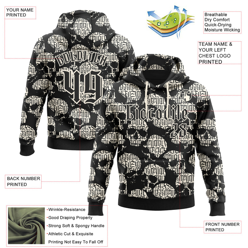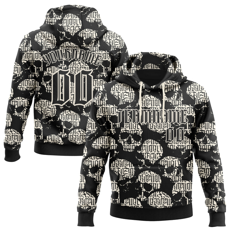 Custom Black Cream 3D Skull Gothic Vintage Grunge Art Sports Pullover Sweatshirt Hoodie