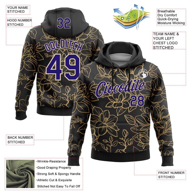 Custom Stitched Black Dark Purple-Cream 3D Pattern Design Golden Subtle Floral Sports Pullover Sweatshirt Hoodie