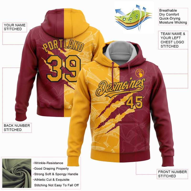 Custom Stitched Graffiti Pattern Gold Crimson-Black 3D Scratch Sports Pullover Sweatshirt Hoodie
