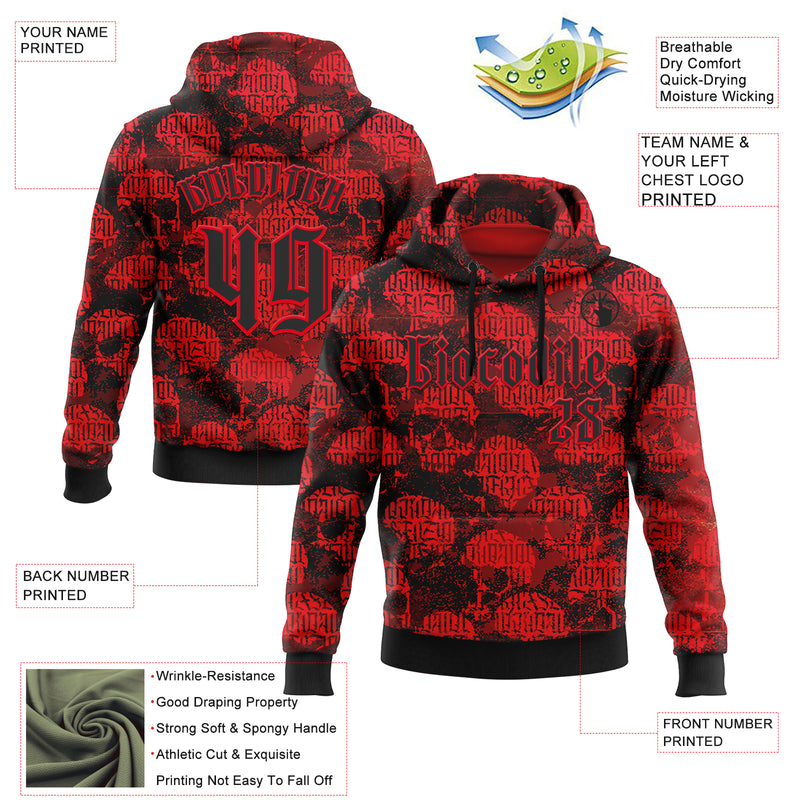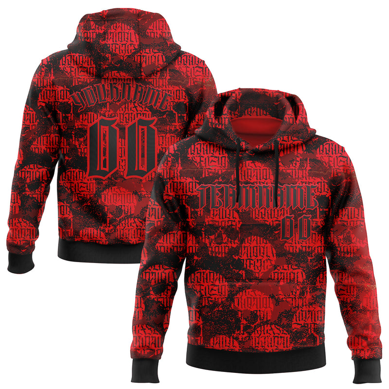 Custom Fire Red Black 3D Skull Gothic Vintage Grunge Art Sports Pullover Sweatshirt Hoodie