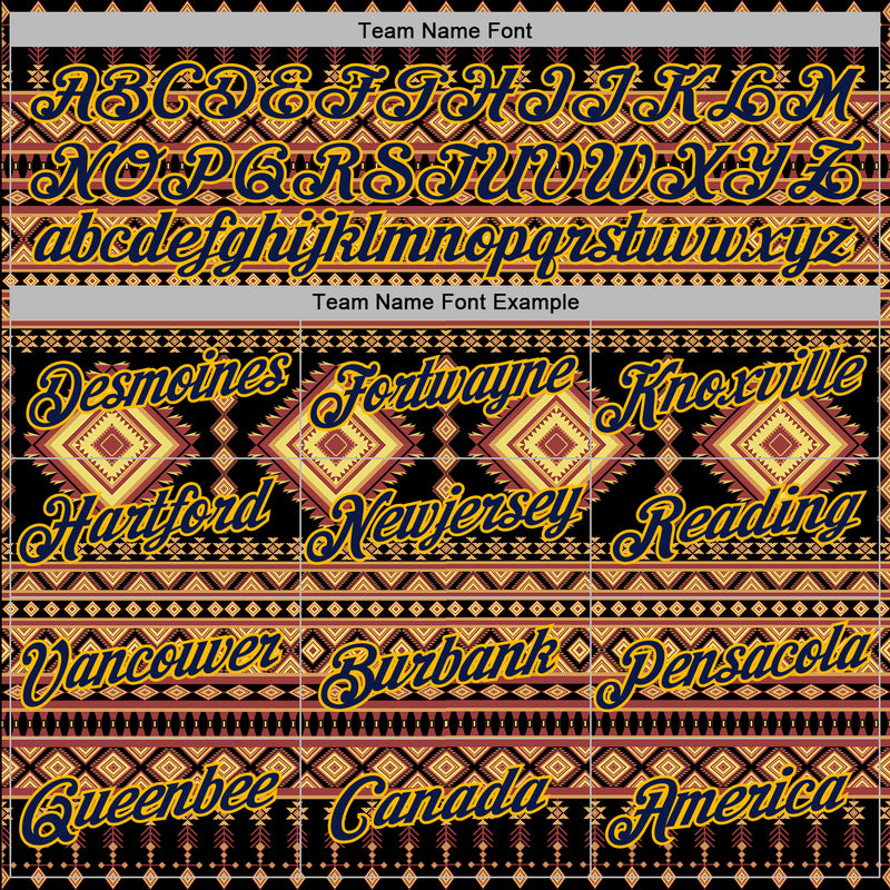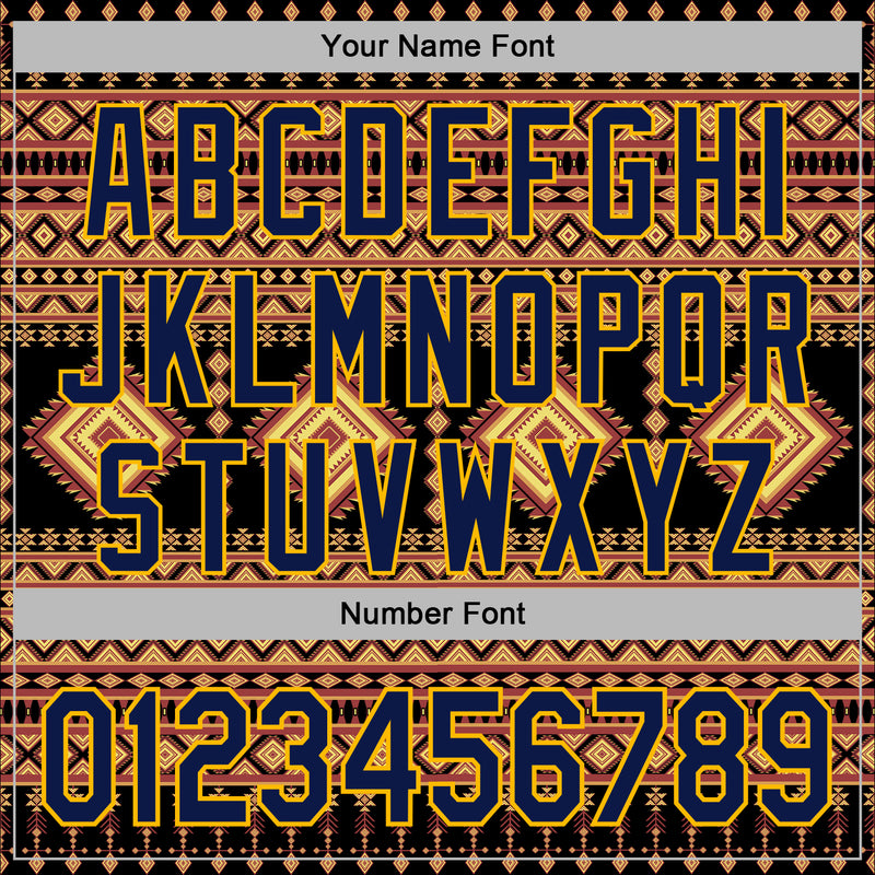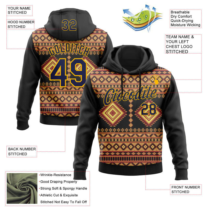 Custom Stitched Black Navy-Gold 3D Pattern Design Tribal Ethnic Native American Sports Pullover Sweatshirt Hoodie