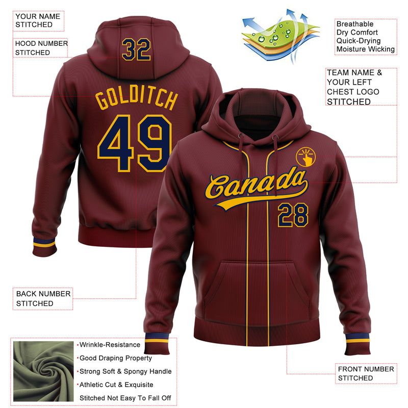 Custom Stitched Burgundy Navy-Gold Baseball Pullover Sweatshirt Hoodie