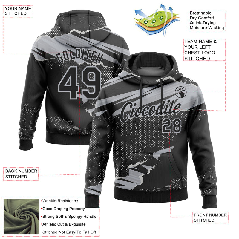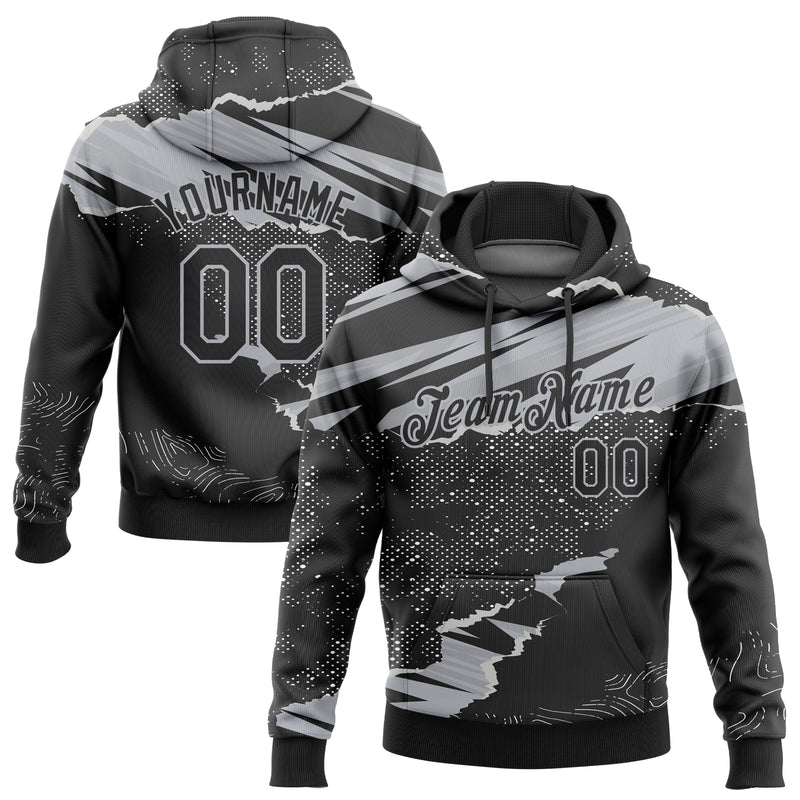 Custom Stitched Black Gray 3D Pattern Design Torn Paper Style Sports Pullover Sweatshirt Hoodie
