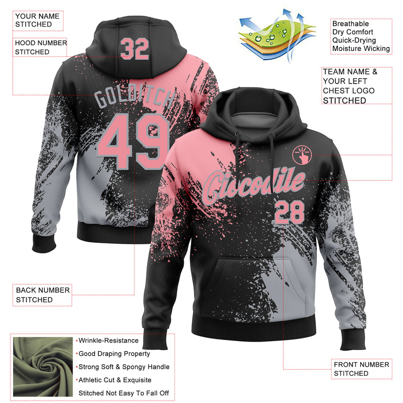 Custom Stitched Black Medium Pink-Gray 3D Pattern Design Abstract Brush Stroke Sports Pullover Sweatshirt Hoodie