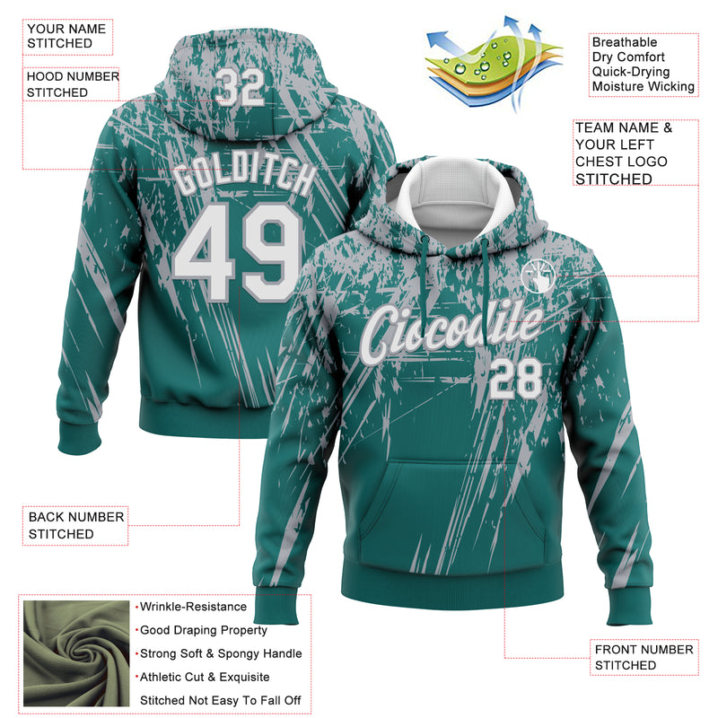 Custom Stitched Teal White-Gray 3D Pattern Design Splash Grunge Art Sports Pullover Sweatshirt Hoodie