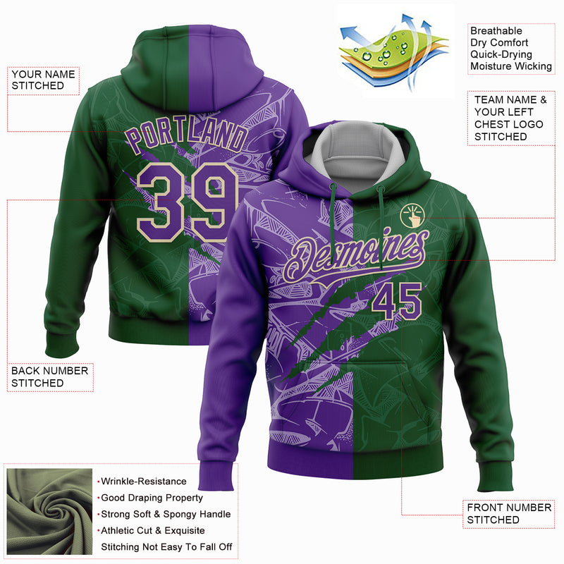 Custom Stitched Graffiti Pattern Purple Green-Cream 3D Scratch Sports Pullover Sweatshirt Hoodie