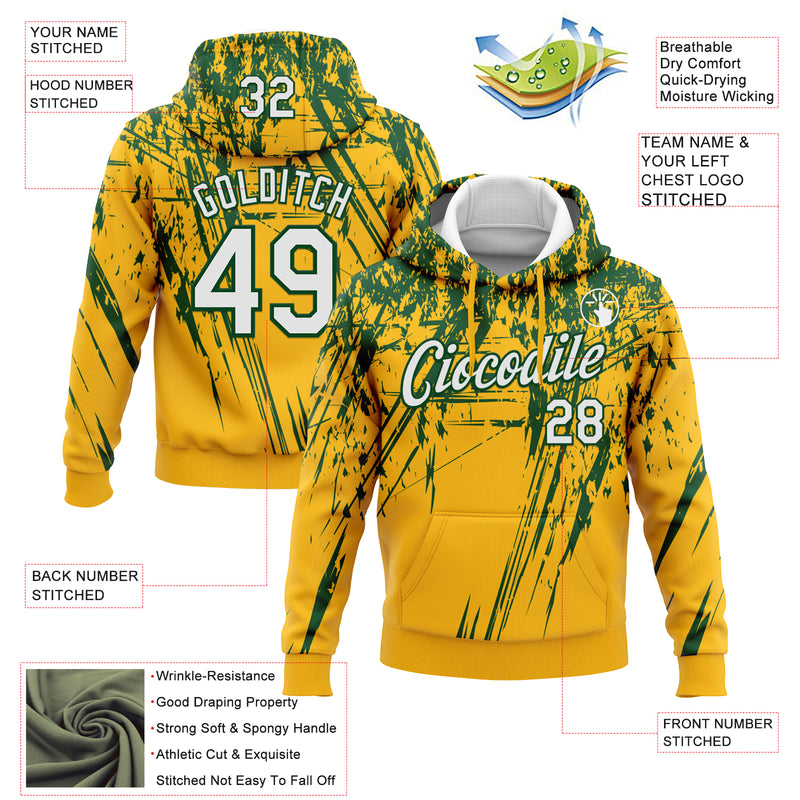Custom Stitched Gold White-Green 3D Pattern Design Splash Grunge Art Sports Pullover Sweatshirt Hoodie